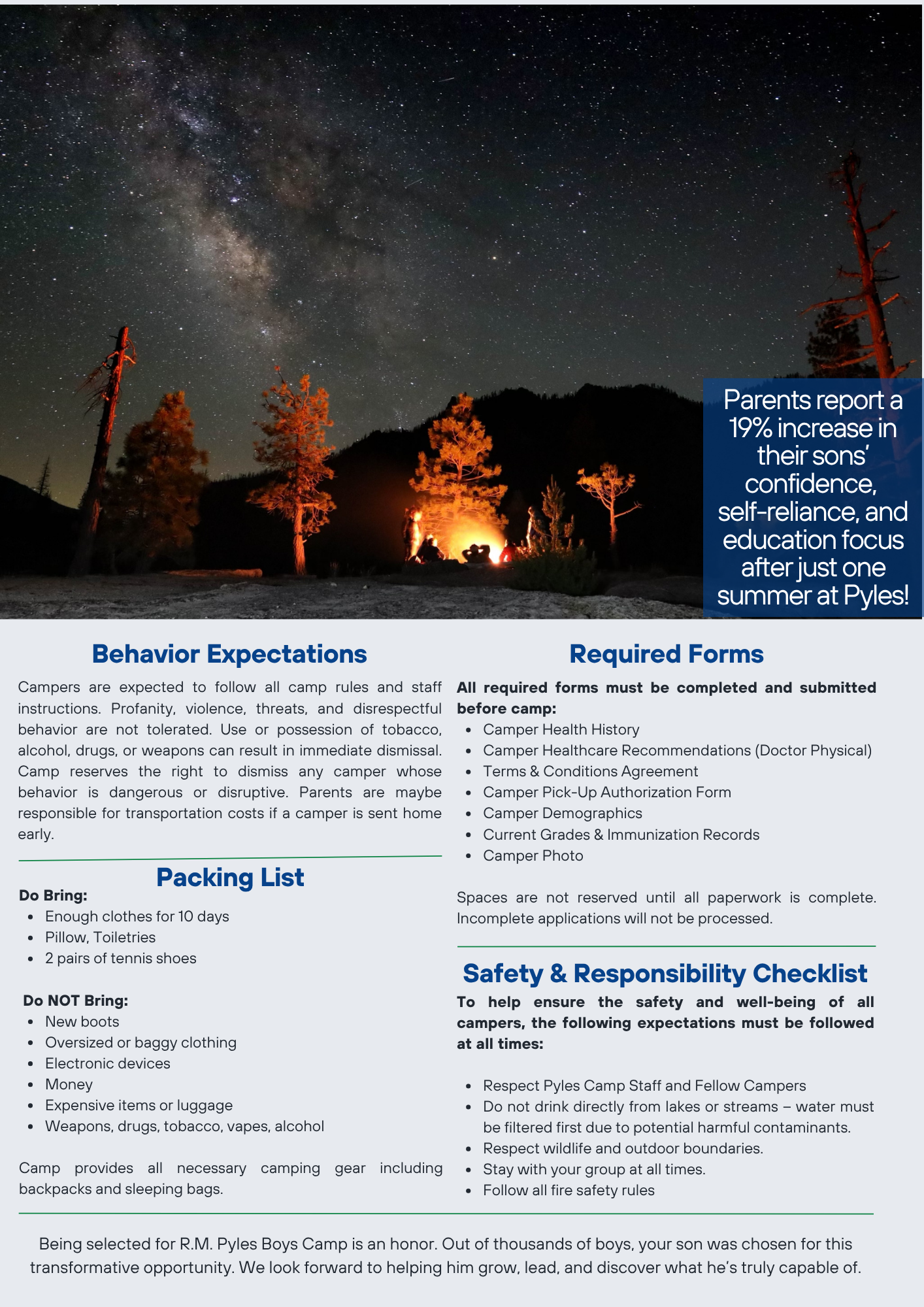 There is no need for money; there is nowhere to spend it. Also, please don't let them bring expensive cameras, watches, cell phones, or any other electronic device. R.M. Pyles Boys Camp will not be responsible for lost, stolen, or damaged property.