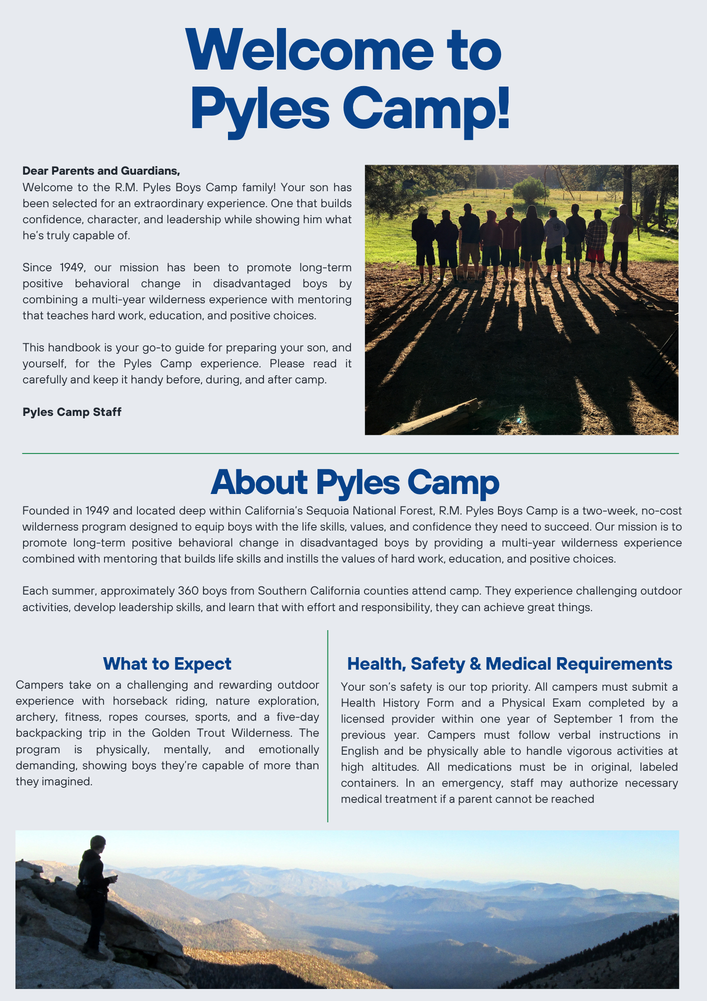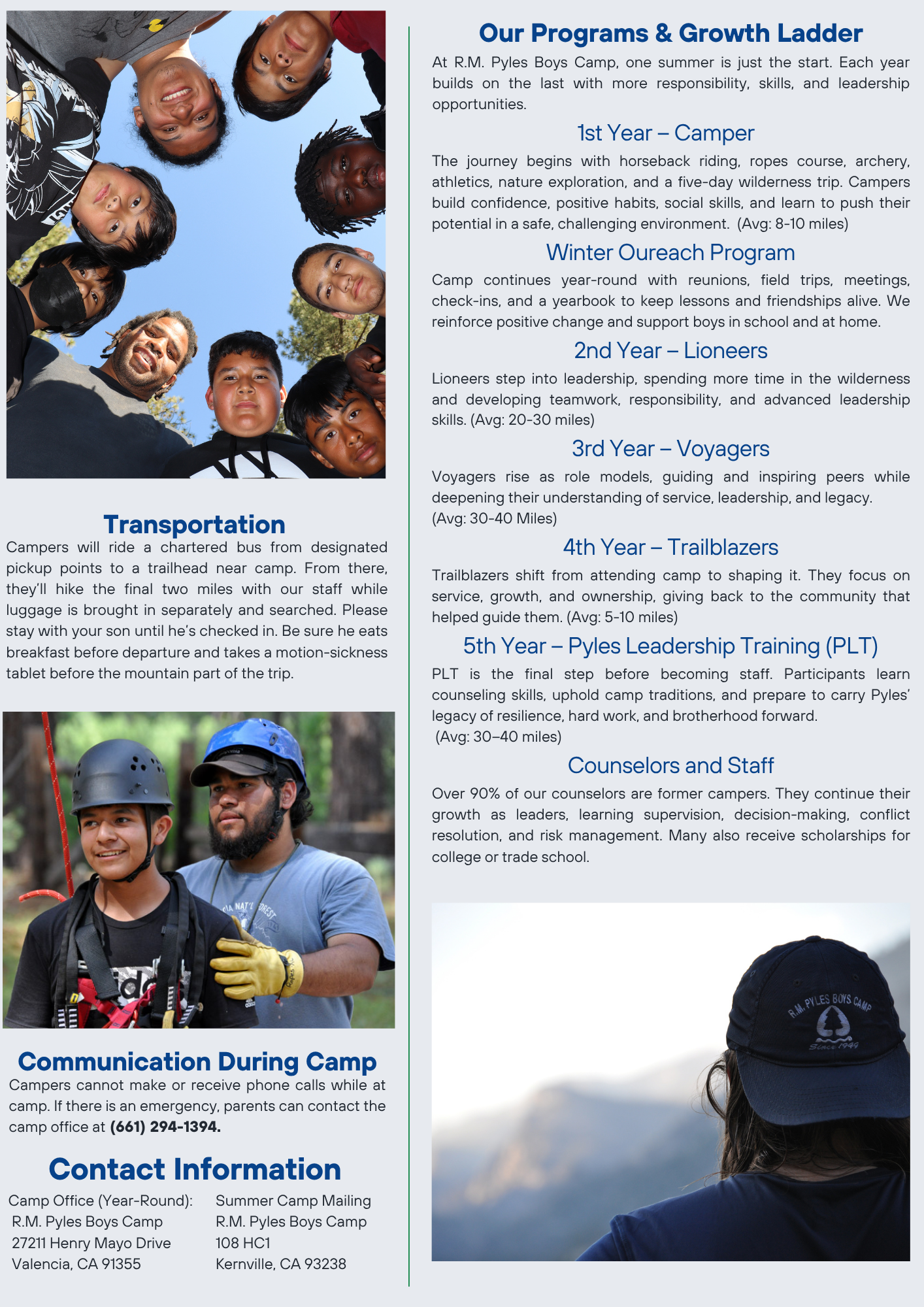 The R.M. Pyles Boys Camp operates in partnership with Sequoia National Forest on a nondiscriminatory basis. Pyles Boys Camp is located at a 5,500’ elevation near Giant Sequoia National Monument approximately 60 miles from Porterville and 100 miles northeast of Bakersfield.